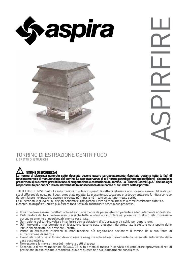 Progettati per essere installati a tetto sulla sommità delle canne fumarie di caminetti domestici. Il loro impiego si rende necessario ogni qualvolta non ci sia un sufficiente tiraggio naturale della canna fumaria, e in tutti quei locali soggetti a fumi, polveri e cattivi odori. Il modello ASPIRFIRE 200 N può essere utilizzato per l’aspirazione di fumi caldi con una temperatura massima di 200°C. Caratteristiche generali