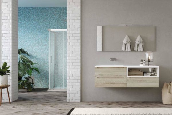 1 cassetto e vano a giorno 70×22,5 cm. Lavabo 140 cm vasca sinistra in mineralmar- mo. Specchio First 140×75 con lampada Boss a LED.