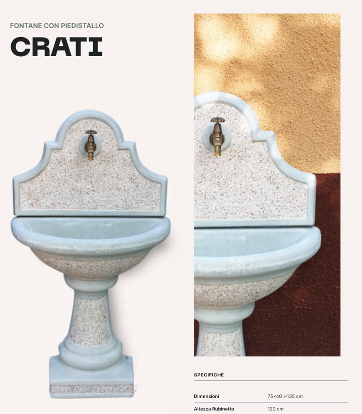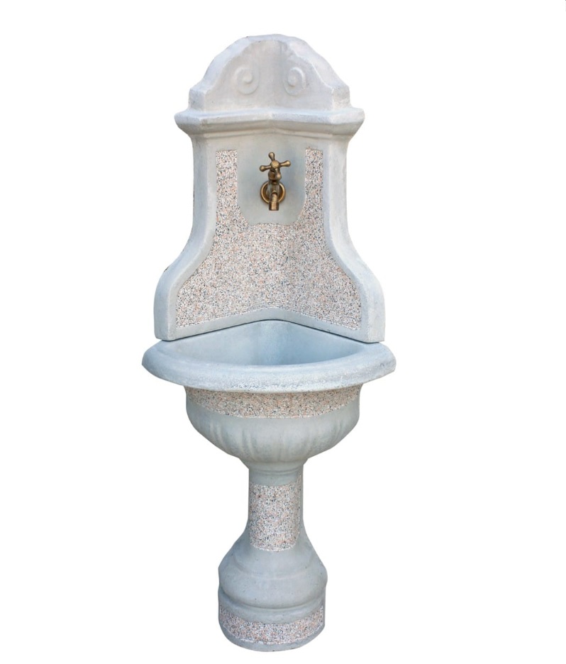 Fontana a muro in cemento e granulato di marmo. Realizzata con finitura martellinata.