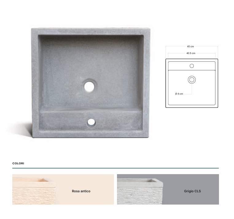 Lavello 45×42 con predisposizione per rubinetto da appoggio. Disponibile nei colori grigio e rosa antico.