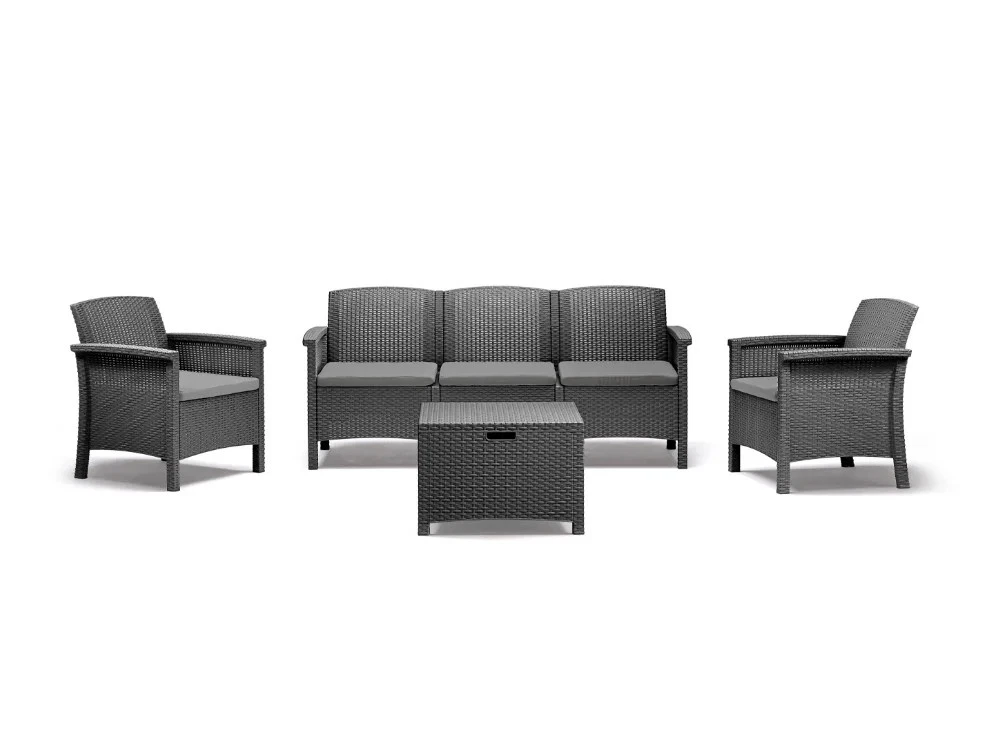 SET DA GIARDINO POLIPROPILENE ‘VENEZIA III’ bianco – BICA SET DA GIARDINO POLIPROPILENE ‘VENEZIA III’ bianco Realizzato interamente in polipropilene ad effetto rattan, resistente agli agenti atmosferici e raggi UV. Dal design moderno ed elegante, risulta essere un giusto compromesso per chi desidera un prodotto robusto, piacevole e che duri nel tempo. Composto da un tavolo a piano rettangolare, due poltrone e un divano a tre posti. Completo di cuscini. grafite BICA TEMPO LIBERO OUTDOOR Arredamento, complementi ambiente, relax Set Venezia per 5 persone finitura rattan composto da: 2 poltrone con schienale alto ed ergonomico 1 sofa 3 posti 1 tavolino porta cuscini 5 cuscini Poltrona: 63 x 64,5 x 76 cm Sofa 3: 172 x 64,5 x 76 cm Tavolino Storage: 60 x 54,5 x 40,5 cm