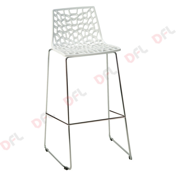 Con seduta in plastica colorata. Il suo originale design, la rende adatta sia in ambienti esterni che interni e collocabile in giardini, bordo piscina, cucine, salotti. Base in metallo cromato, tondino da Ø 11 mm. Dimensioni: cm 50x47xh.98. Articolo fornito smontato.