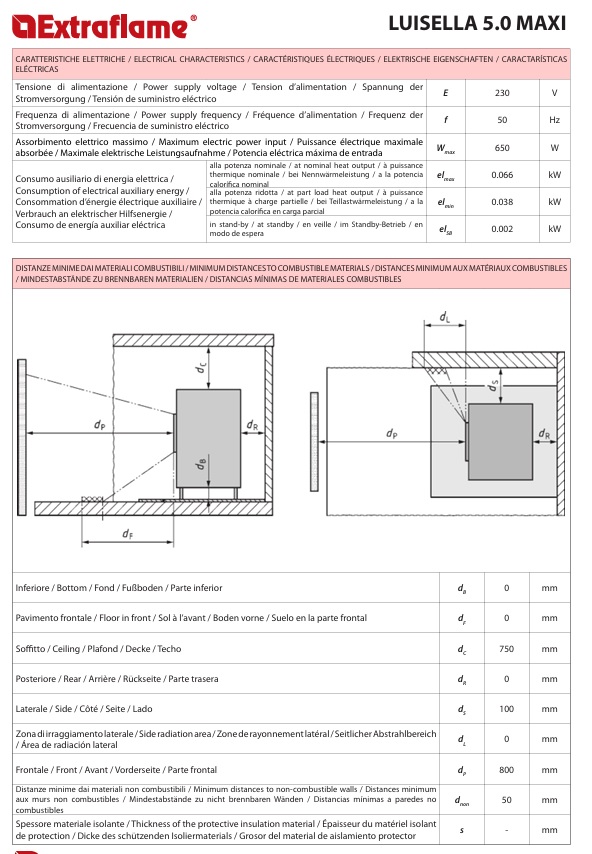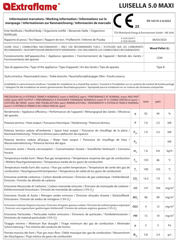 Ventilazione ambiente superiore con motore dedicato ed escludibile – Scambiatore di calore a fascio tubiero – Profondità ridotta – Consumo orario 0.6÷1.6 kg/h – Capacità totale serbatoio 10 kg – Diametro scarico fumi (Ø)80 mm P/S/LAT.DX – Rendimento94-92% – Peso Netto 99 kg – Certificazione Ambientale DM186 – Classe Energetica A+ – Easy Control – Easy Setup – Wi-Fi integrato (App “Total Control 3.0”) – Misura 639x290x892 mm – Norme EN 14785:2006